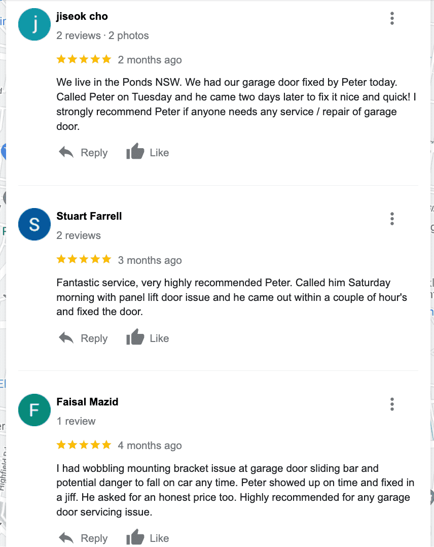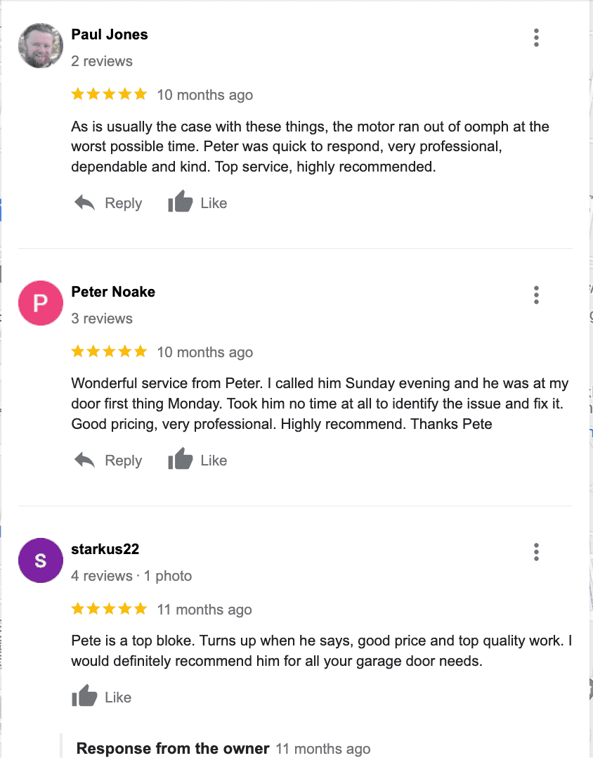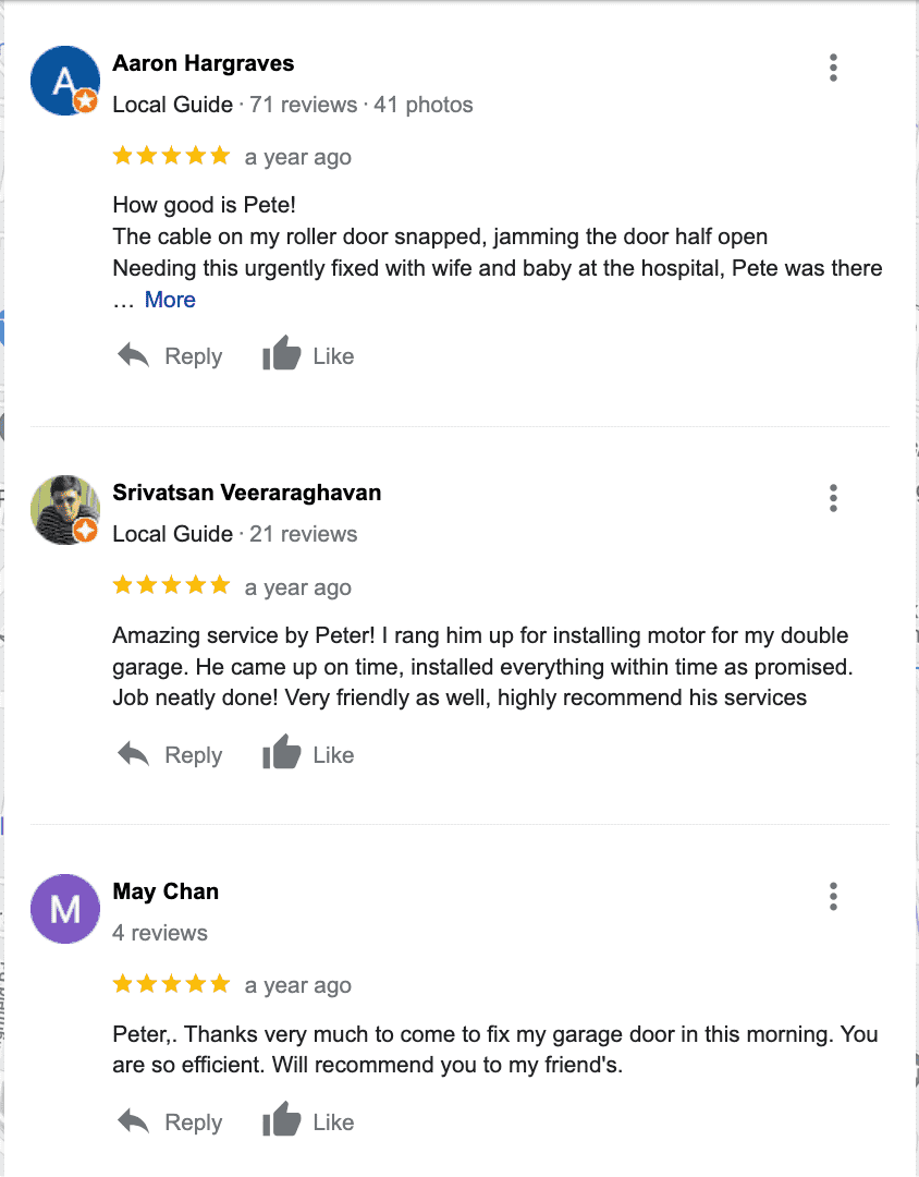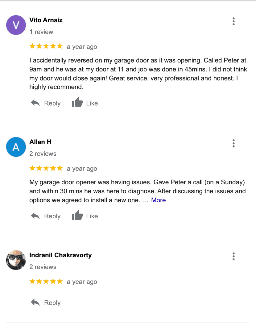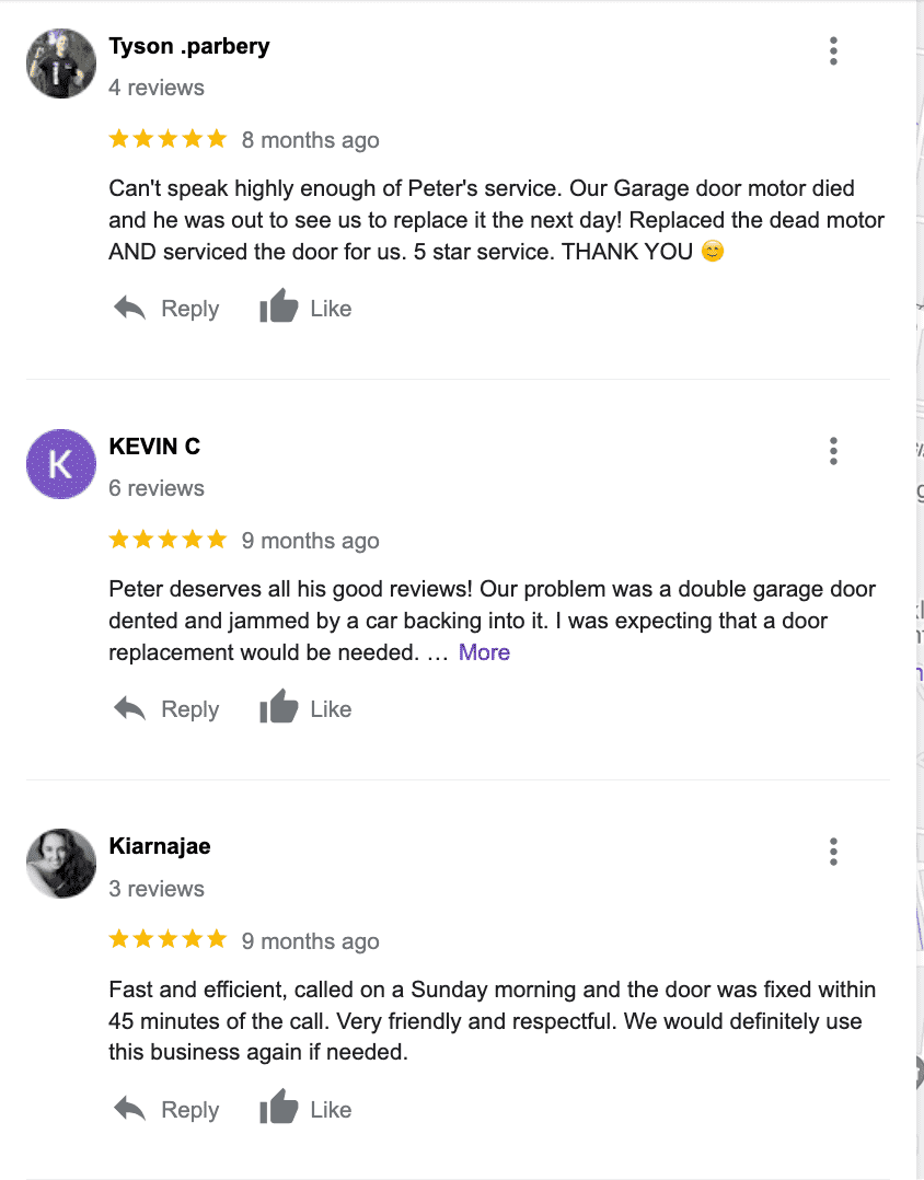 Very helpful as he stayed with us over the phone to diagnose the problem then arrived in less than hour to do the replacement and installation of what we need done efficiently and quickly. Friendsly service and fair prices. Will definitely be our go to for any garage door repairs in future. Thank you Peter!